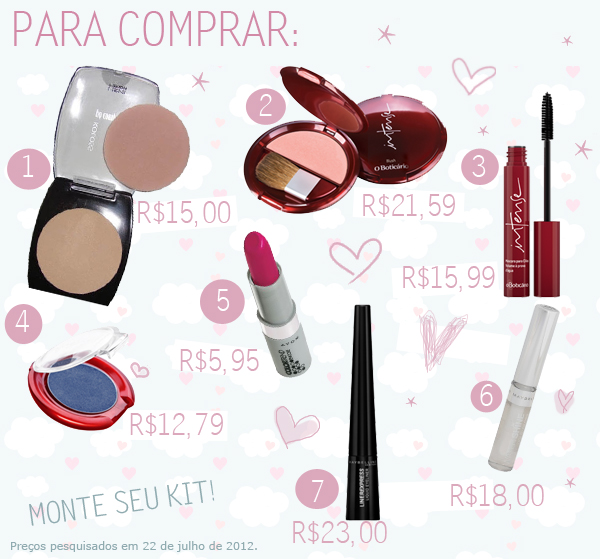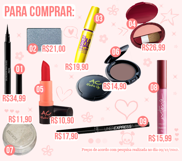 OBS: Na indicação de produtos eu não coloquei os itens de maquiagem para preparar a pele (primer, corretivo, pó, base, blush, e etc).