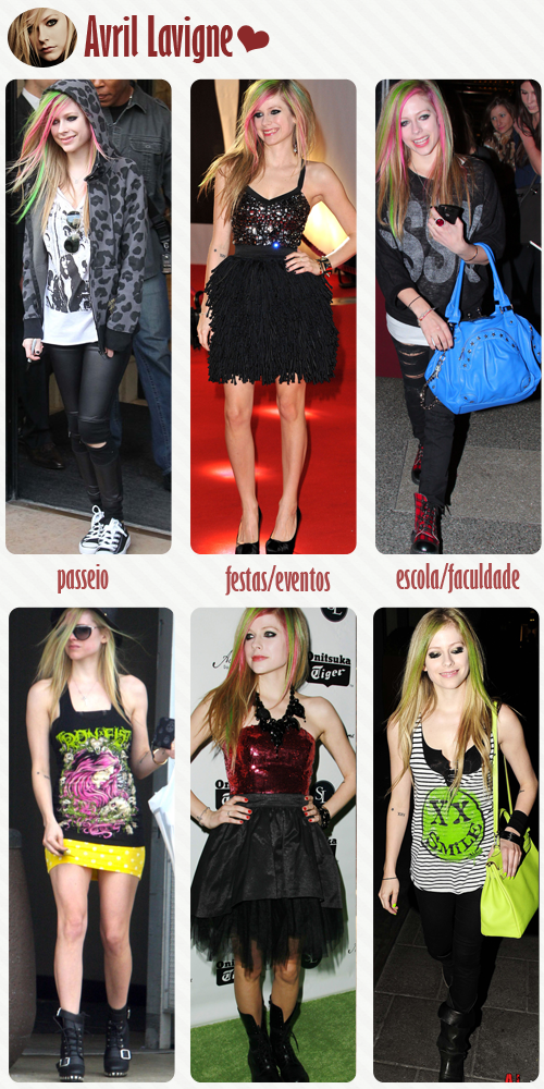 E, para finalizar, os modelitos para escola/faculdade são básicos, mas cheios de atitude. O primeiro é todo preto, somente com pontos de cor no coturno e na bolsa. O segundo é mais divertido e a sobreposição de duas blusas ficou um chame. A Avril arrasou, não é?