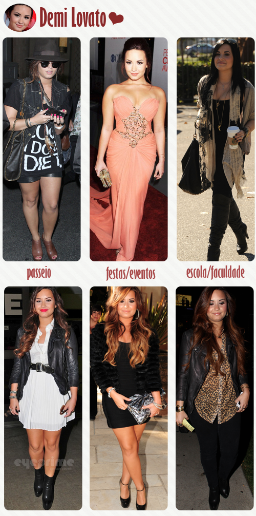 Demi Lovato se destaca por seus looks sensuais e bem elaborados. A garota anda apostando em muitos vestidos, jaquetas de couro e vários acessórios. Demi é minha inspiração quando não sei o que usar em uma festa ou um passeio no fim de tarde. Ela arrasa em todos os modelos que escolhe e dificilmente erra!