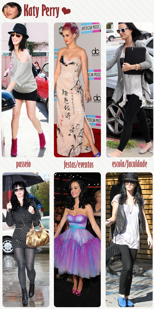 Para a escola/faculdade, tive bastante problema em escolher só dois: Katy usa roupas bem básicas quando sai em público. Mas, mesmo sendo simples, ela consegue combinações lindas. Eleger somente duas foi difícil… Então, optei pelo que mais vejo a cantora usando: leggings com blusinhas bem soltas por cima. E claro: sempre um colete ou cardigã como sobreposição.