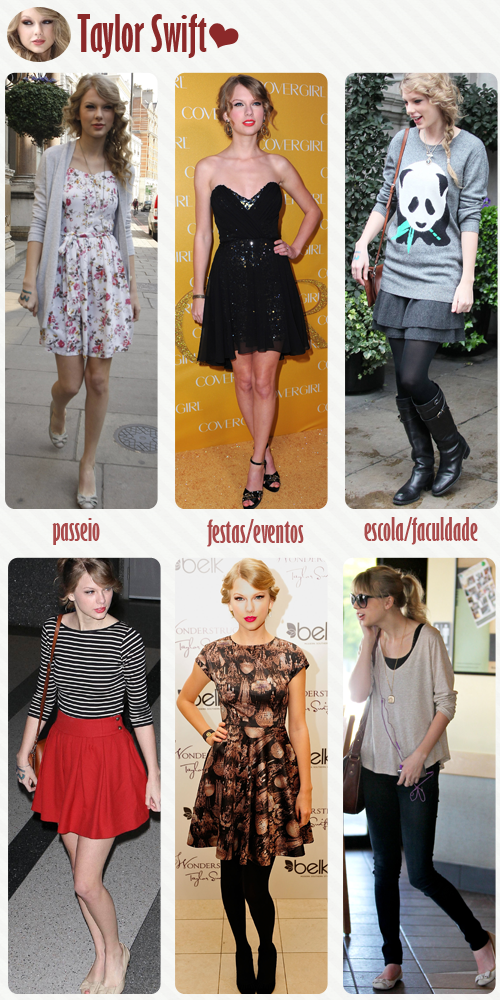 Taylor Swift é o exemplo da garota romântica: ela curte looks bem fofos, com muitos vestidos e saias soltinhos. Além disso, ela adora estampas florais, que são a marca do estilo romântico.