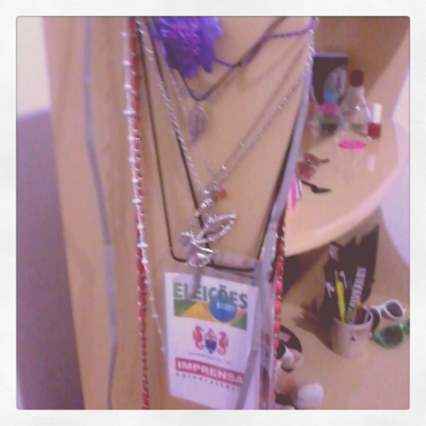 COISINHAS ALEATÓRIAS: A mesa onde fica meu computador é uma das coisas que ocupam mais espaço no meu quarto. Por isso, tento colocar tudo o que posso lá, assim livro outros lugares e decoro a mesa do jeito que gosto. Então, na lateral, coloquei algumas coisinhas que têm valores para mim. Esses “crachás” são das duas vezes que “cobri” algum evento pela Universidade (o da frente foi nas eleições e, o que está atrás, nos jogos que acontecem todo ano na facul). Além disso, também coloquei alguns colares (o de fada, o do McFLY e o da metade de coração que minha amiga me deu), uma bolsa e um headband que nunca mais usei.