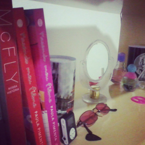 LIVROS + OUTRAS COISAS: Lembram que eu falei sobre a mesa do computador? Bom, ela tem duas “prateleiras” em cima. A do topo, eu deixo minha impressora e alguns cremes que uso no dia-a-dia. Na outra, que é esta da foto, decorei com coisinhas que gosto (e, no caso dos livros, que não tenho mais onde deixar, já que meu guarda roupa – que é onde guardo – não cabe mais nenhum!). Nela estão meus dois cofres, um espelho que ganhei da minha avó há um tempo (<3), alguns perfumes e outras coisinhas que gosto.