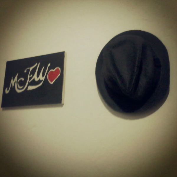 QUADRO + CHAPÉU: O quadro eu já tenho há um bom tempo. Desde que o pintei, não o tiro da parede. Ele se tornou uma parte indispensável do meu quarto! Já o chapéu, eu o comprei há uns bons três anos. Quase não o uso e ele estava ficando todo deformado por estar guardado no guarda-roupa e sempre ter algo em cima dele. Então, resolvi colocá-lo na parede junto ao quadro do McFLY (minha banda favorita <3). Mesmo porque o chapéu me lembra muito o Tom Flecher! haha.