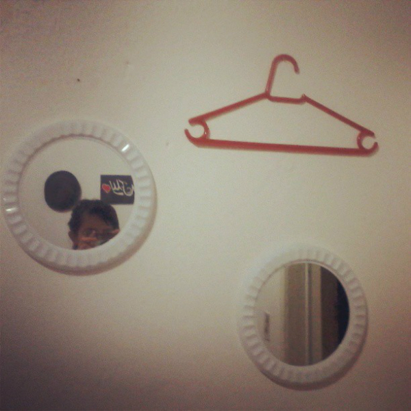 Os espelhos você pode usar aqueles pequenos que vende em lojinhas de R$1,99. Há alguns meses, comprei dois e cada um custou R$4. Coloquei os dois na parede, um ao lado do outro (foto). Como eu fiz a arte de derrubar um (hehe), troquei o local do outro por um lenço, provisoriamente.