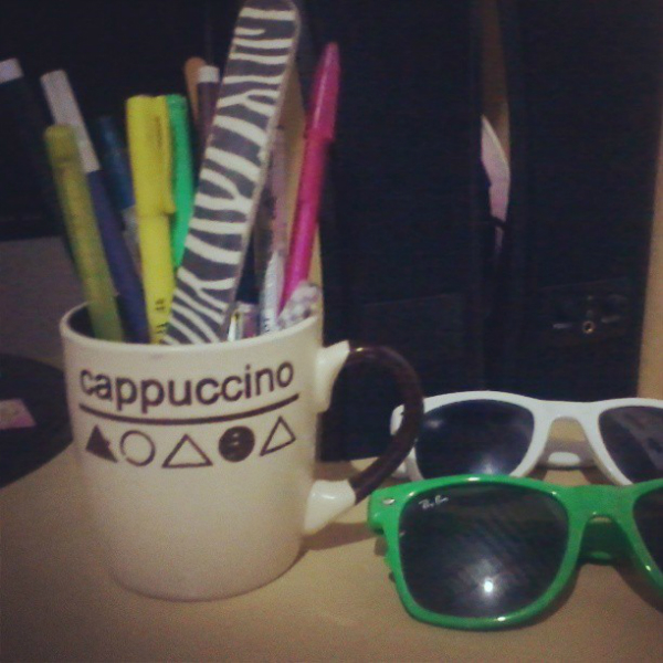 CANECAS E ÓCULOS: Não tem nada mais charmoso que canecas! Adoro usá-las na decoração, principalmente para guardar canetas e pincéis de maquiagem. Ao lado, deixei meus óculos escuros que nunca uso (não enxergo com eles! haha).