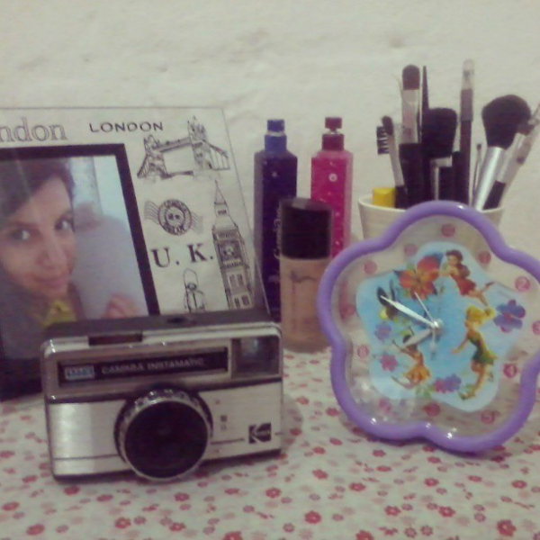 RELÓGIO + CÂMERA + PORTA RETRATO + OUTRAS COISAS: Enquanto estou sem um criado mudo, roubei uma mesinha da sala para guardar algumas coisinhas. Em cima, deixei um porta retrato com desenhos de Londres (<3), dois perfumes da Capricho, outra caneca com pincéis de maquiagem, rímel e delineador, minha câmera do tempo da vovó e, por fim, minha nova aquisição: o relógio da Tinker Bell! Sim, eu adoro a fadinha mais fofa do mundo haha s2. Embaixo da mesinha estão umas caixas decoradas onde guardo alguns itens de maquiagem, documentos pessoais e acessórios (ensinei a fazer aqui, lembram?). Aproveitei e deixei umas revistas por perto, também.